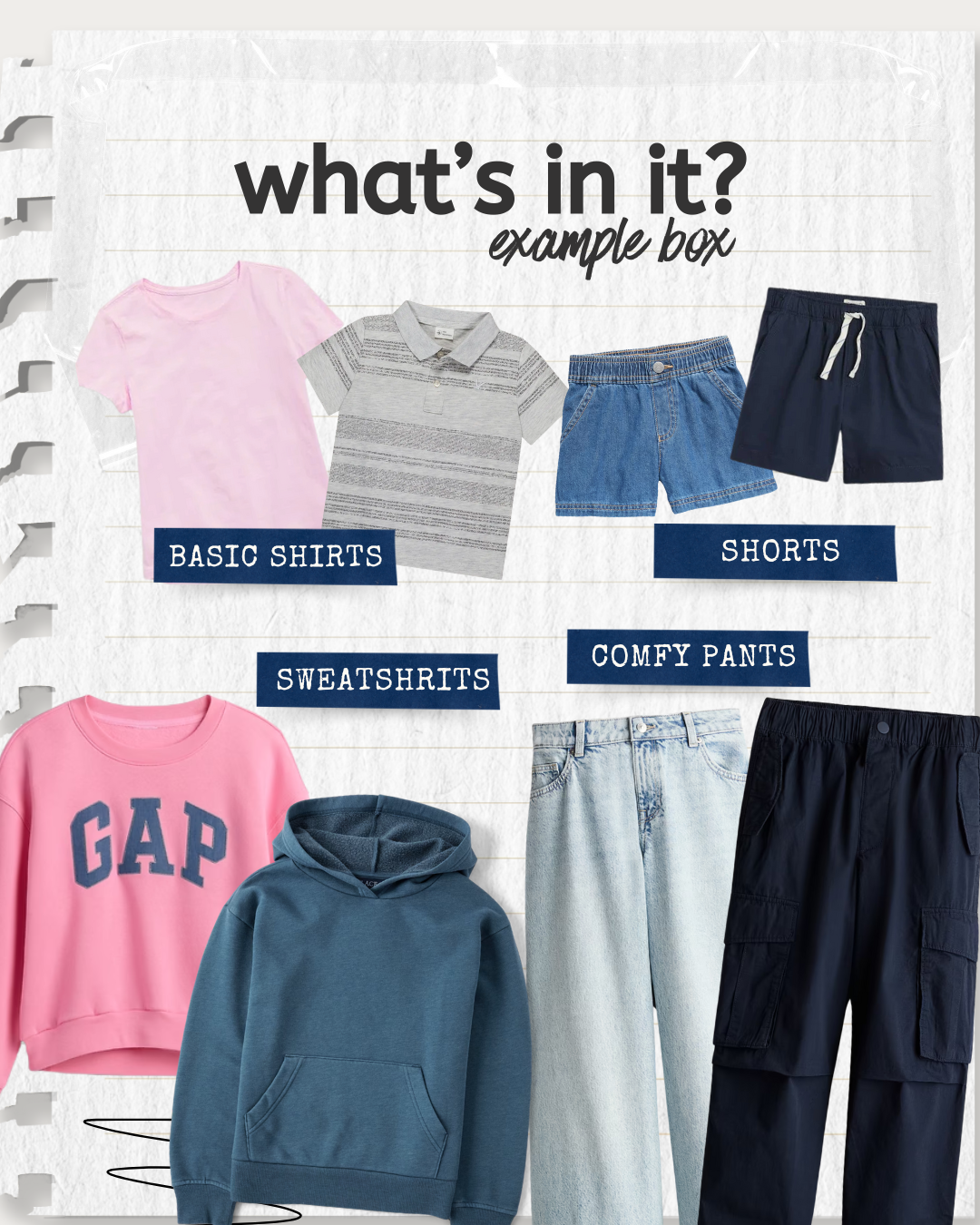 - 6 pieces (casual tops, graphic tees, jeans, leggings, skirts)